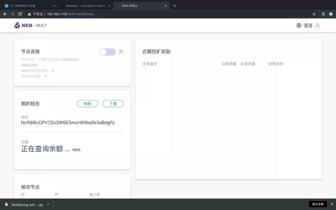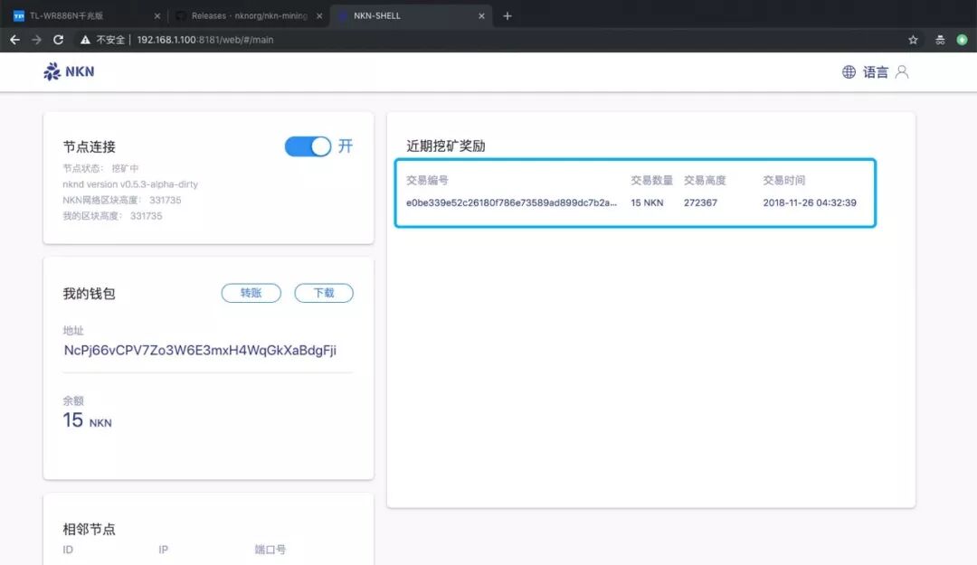 这是我当时用电脑映射后挖成功的第一个块,每挖到一个块都会在右边列表显示,每个块目前是15个NKN,一个节点平均一天可以挖到2个块,也就是30个NKN。