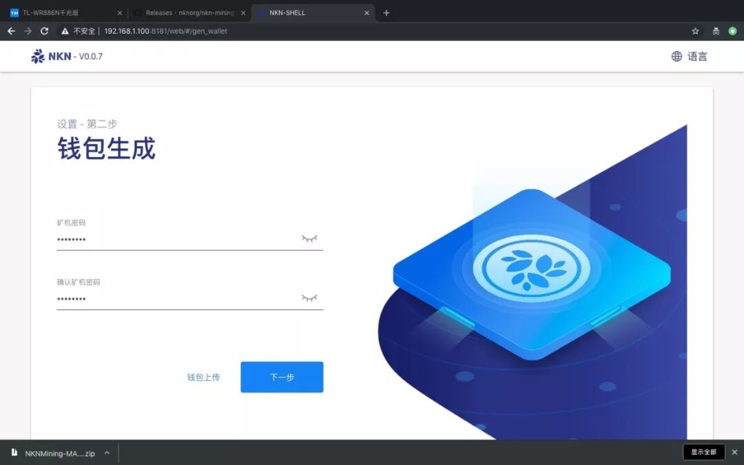 3.填写矿机密码并生成钱包