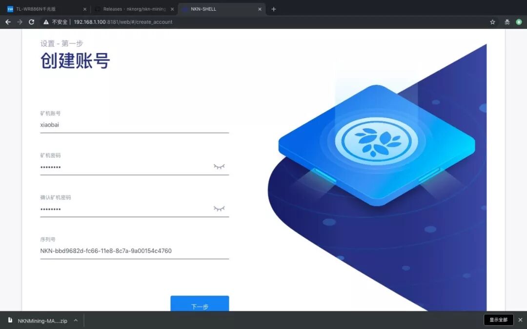 2.右上角可以切换语言切换成中文,然后给自己设置矿机账号和密码以及填写刚刚进程里面得到的序列号后进入下一步