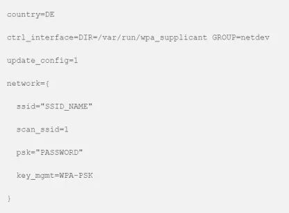 方式二:在树莓派 Zero W 型号上进行傻瓜式的安装除了用于 WiFi 配置的附加文件部分,在树莓派 Zero W 型号上进行的傻瓜式安装基本上与其他其它树莓派型号相同。这里注意在树莓派Zero W型号上必须将两个文件复制到SD卡:空文件名为“ssh”(没有任何文件扩展名)使用以下代码调用名为“wpa_supplicant.conf”的配置文件。 这里根据您的需要调整配置文件中国家/地区代码,ssid 和 psk。
